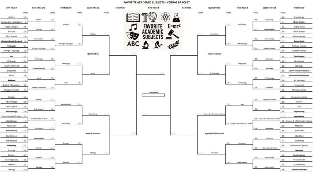Only 8 choices are left in our Favorite Academic Subjects voting bracket. It’s the top 2 in each division.