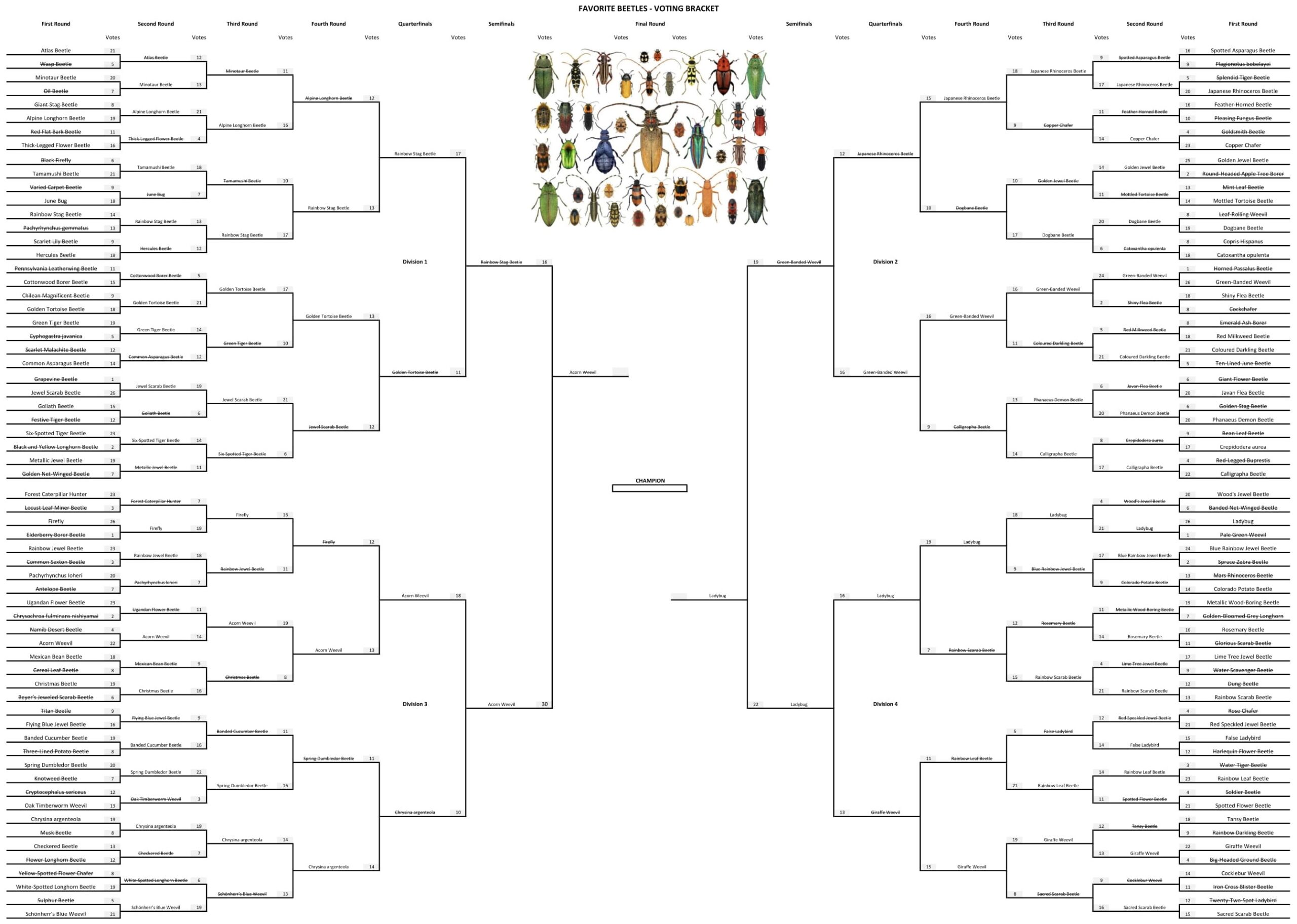 - Acorn Weevil beat Rainbow Stag Beetle by 14 votes