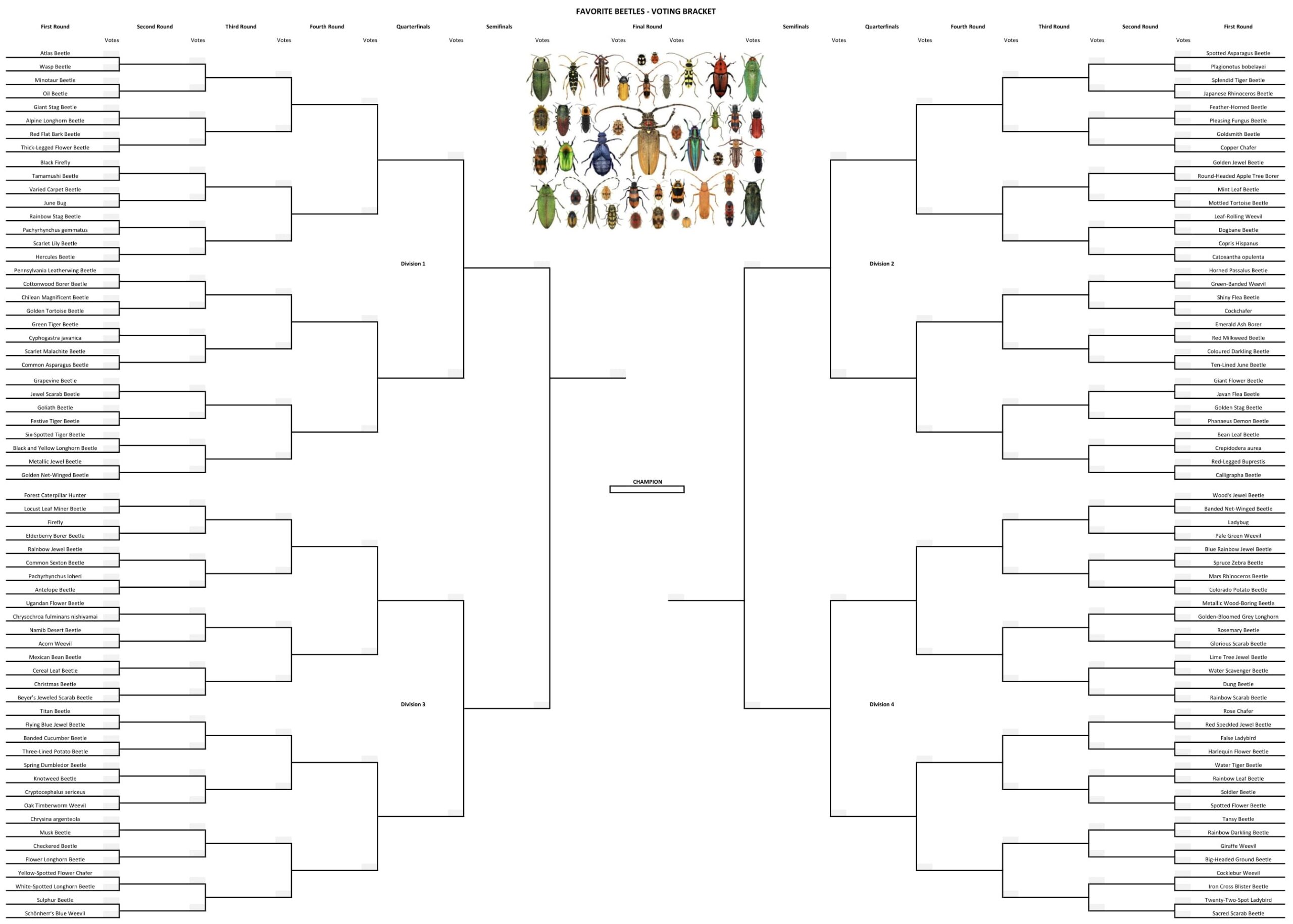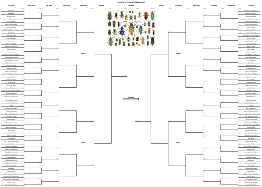 Our next Voting Bracket topic is a DOUBLE bracket of our Favorite Beetles! (Bugs, not band members 😁) That’s 128 different beetles! They are seeded into the bracket randomly and I’ve included their length because you can’t always tell the size from photos.