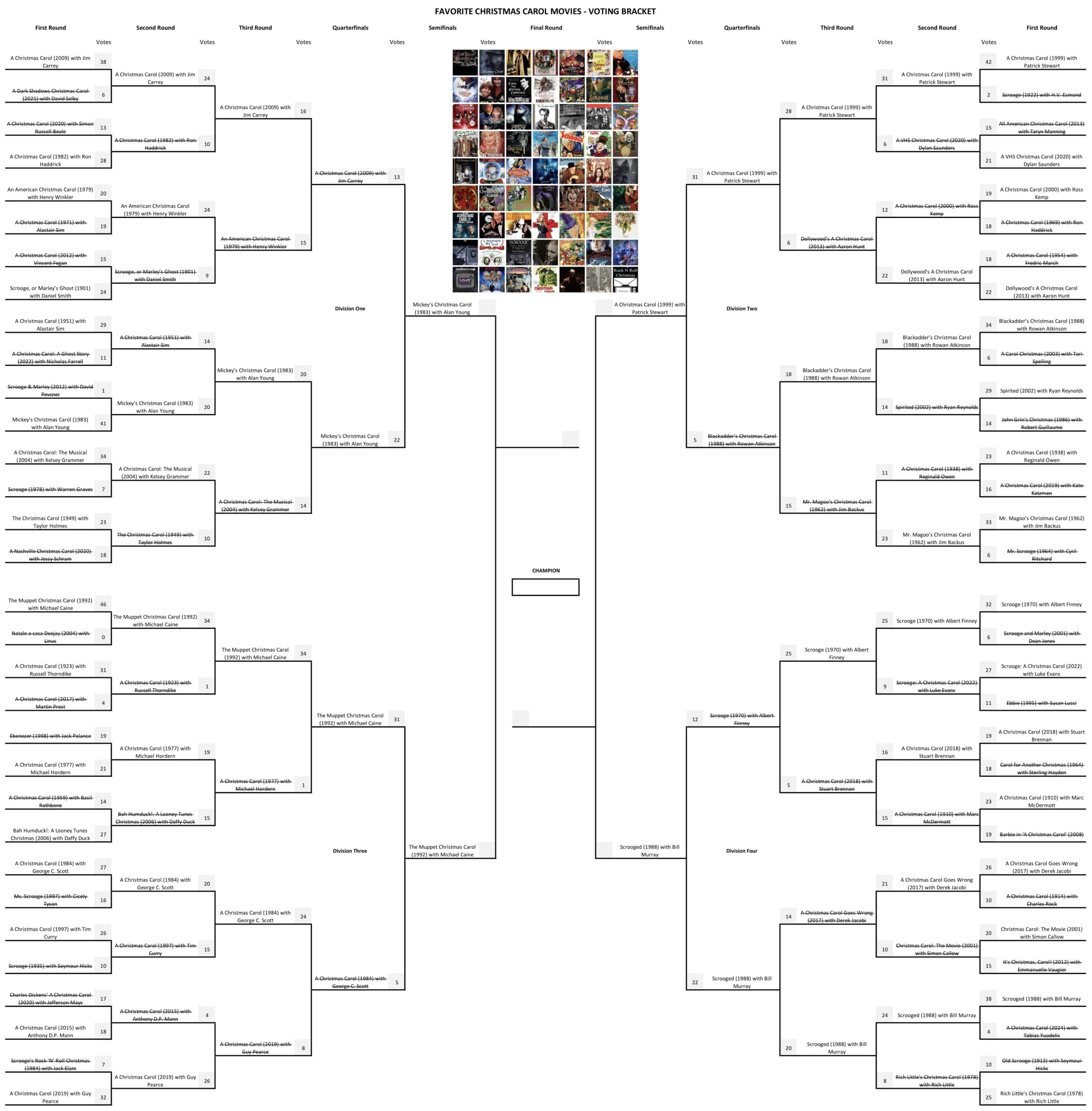 We’re down to the top 4 Favorite Christmas Carol Movies in our voting bracket. All four had solid wins in the last round.