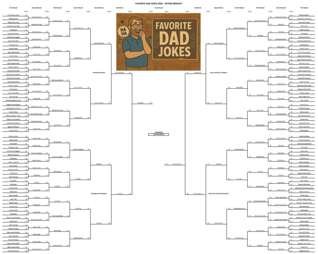 Thanks to everyone who voted. Below is a list of the top favorite dad jokes based on your voting, followed by the complete bracket in JPG and PDF formats.
