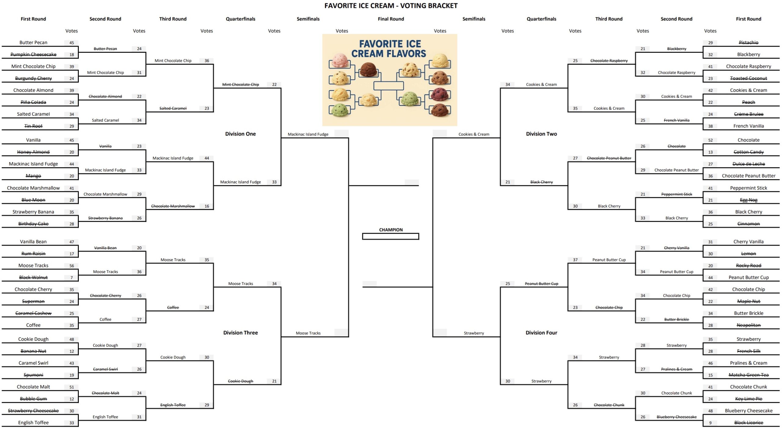 The only close vote in the previous round was Strawberry over Peanut Butter Cup by 5 votes.