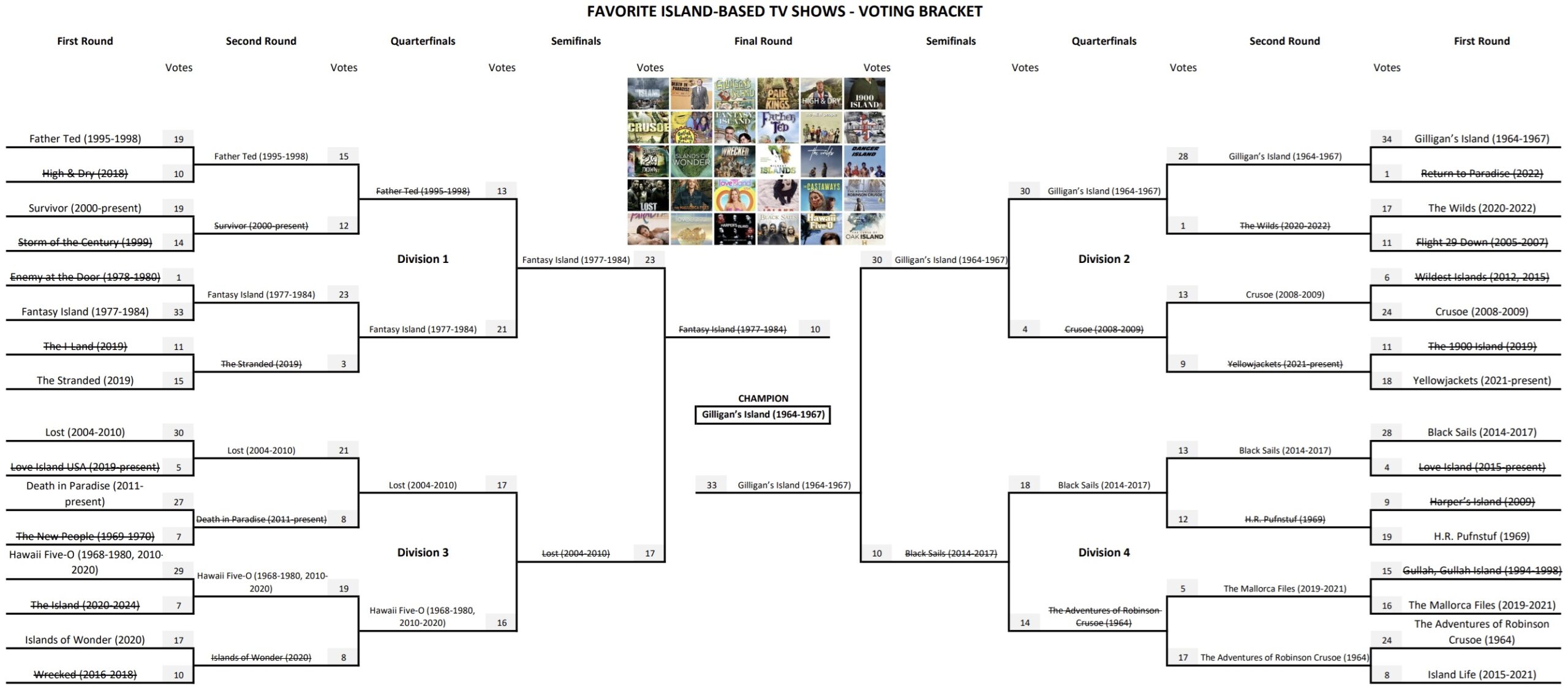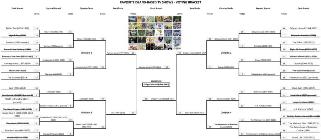 Thanks to everyone who voted. Below is a ranked list of your favorite TV shows set on an island, followed by the complete bracket in JPG and PDF formats, so you can see all the numbers.