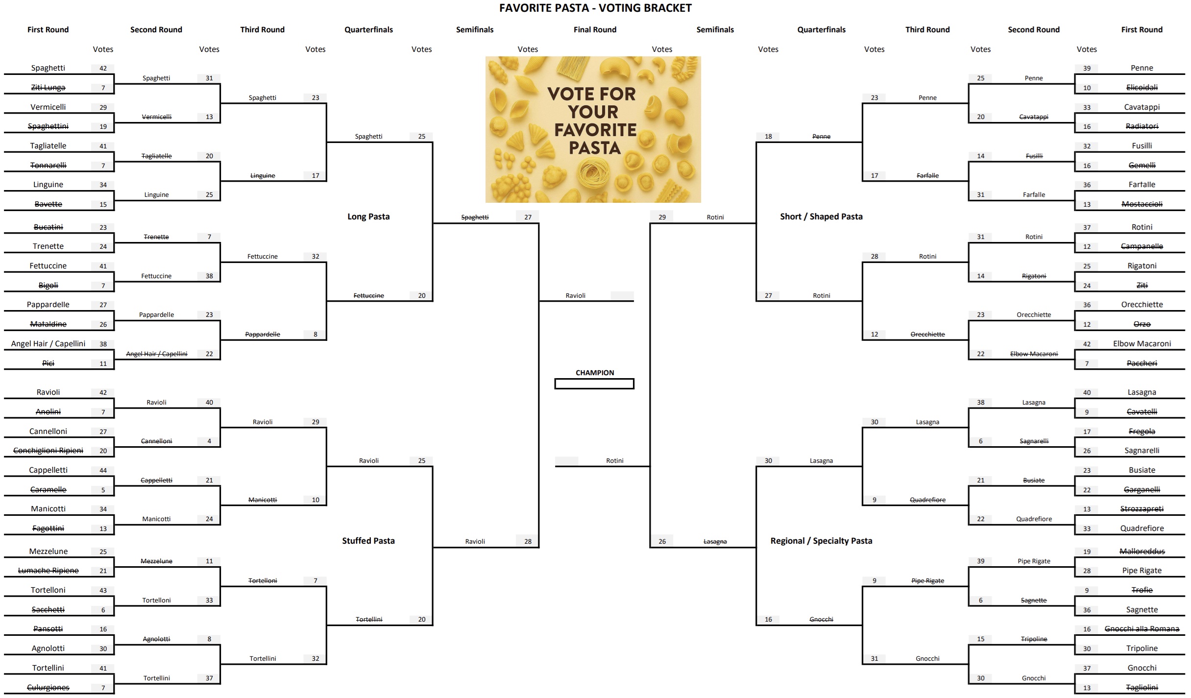 Our Favorite Pasta voting bracket is down to the final two choices: Ravioli vs Rotini!