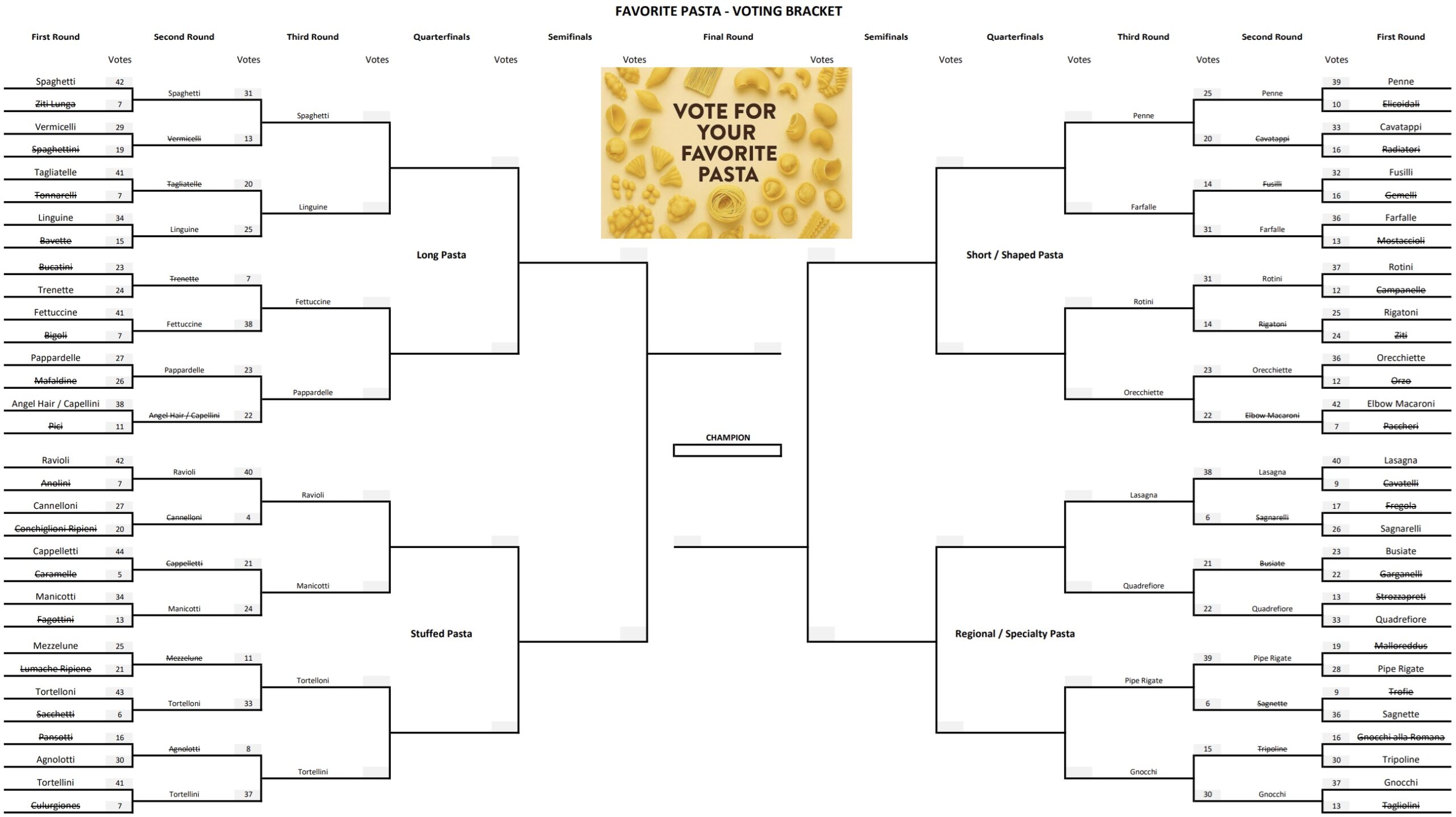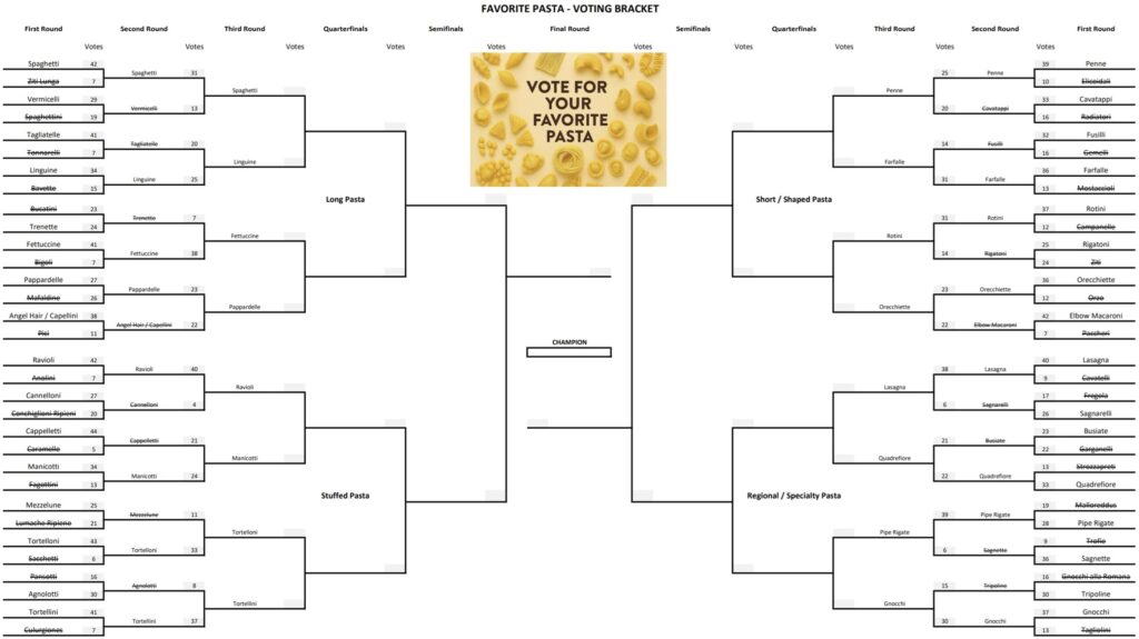 Round Three of our Favorite Pasta voting bracket means only 16 are left!