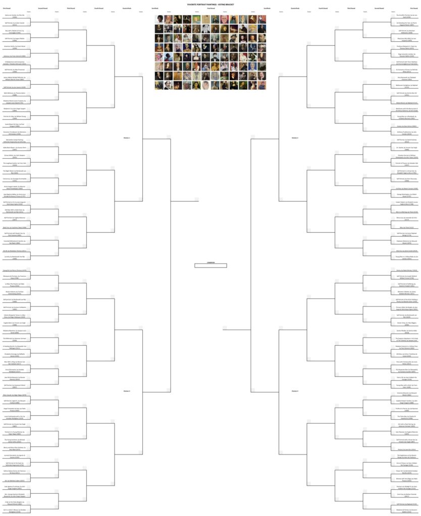 Our next voting bracket is a DOUBLE bracket of our Favorite Portrait Paintings. These are 128 paintings of portraits from throughout time and in various styles, randomly spread across the bracket.