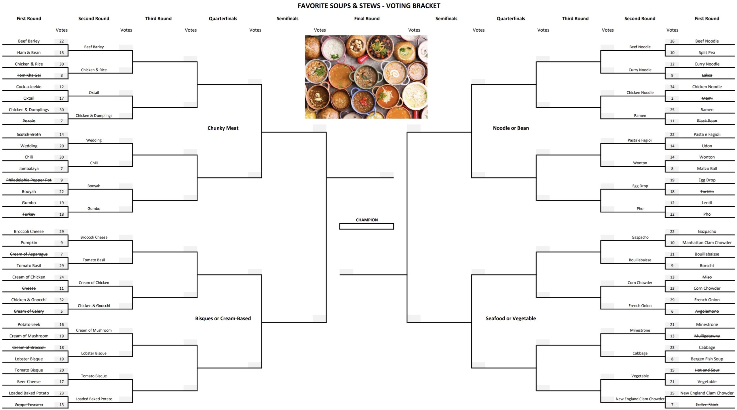 Our current voting topic is Favorite Soups & Stews. They are broken into four divisions: