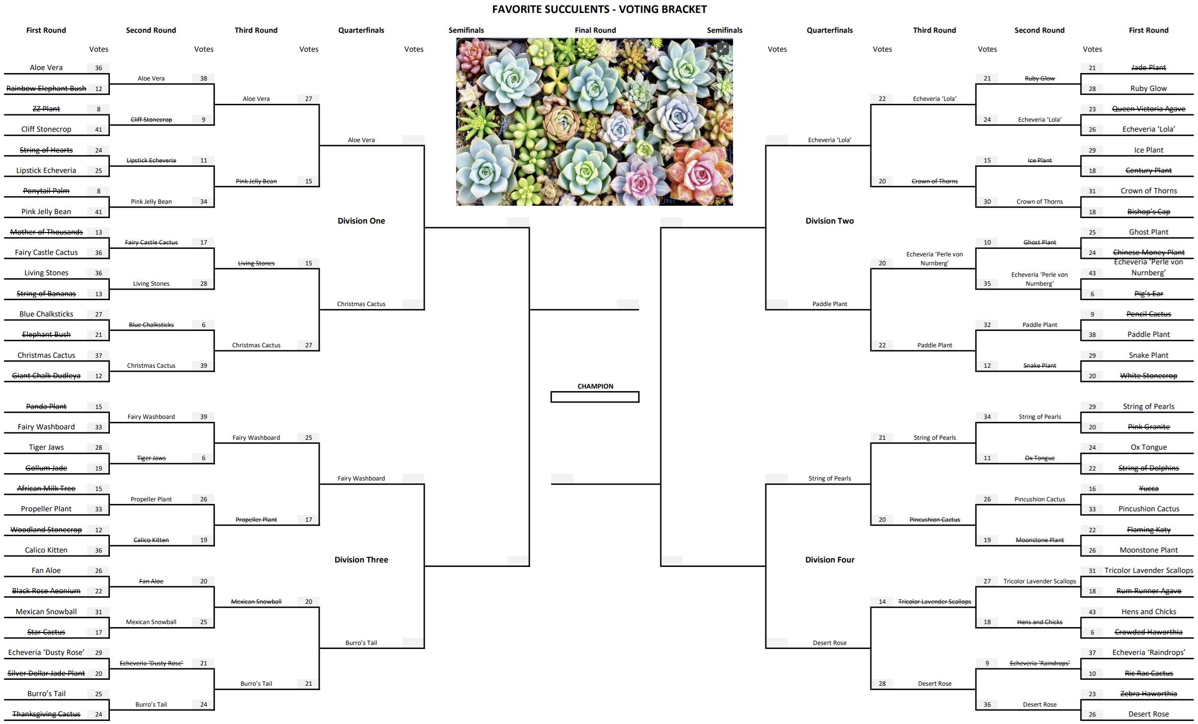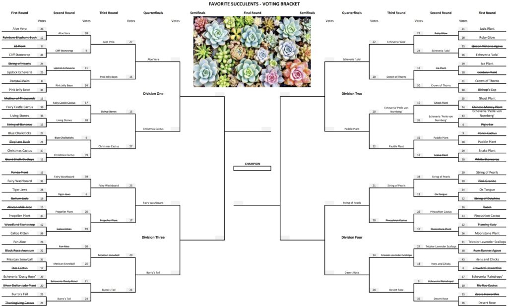 We’ve reached the quarterfinals in our voting bracket for Favorite Succulent Plants. It’s the top two in each division. Half of the votes from the previous round were super close: